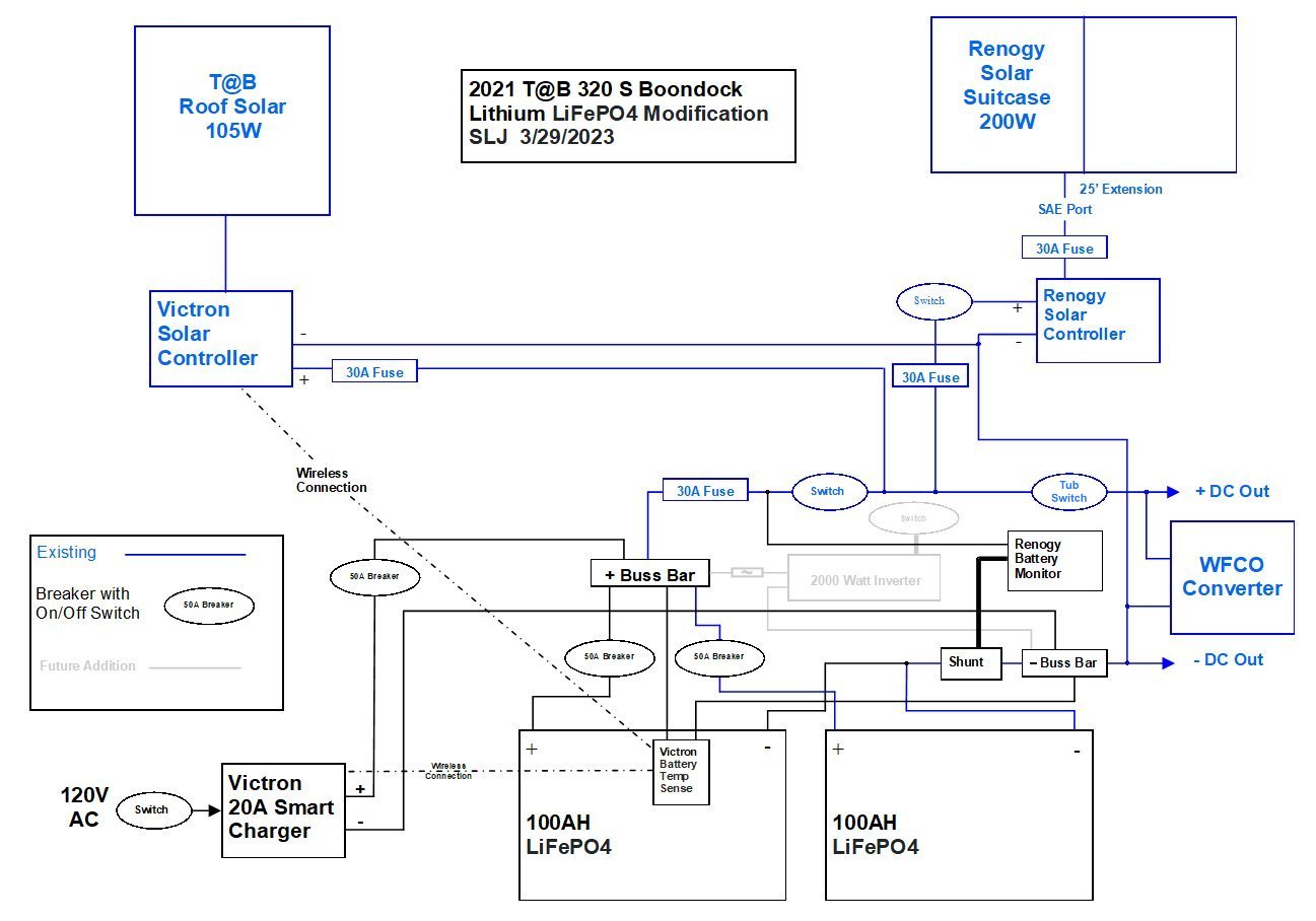 A new AGM battery (sealed with quicker charging than standard lead acid batteries) was added with a box vented out underneath the camper. Eight gauge wiring was used inside flexible conduit from the new battery location back to the original front box where I installed a junction box to protect the original connections.