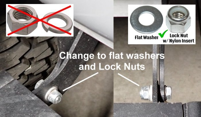 I suggest you replace all of the pivot nuts and lock washers with regular washers with lock nuts as soon as possible. The piviot bolts from the factory with just lock washers and regular nuts loosen,