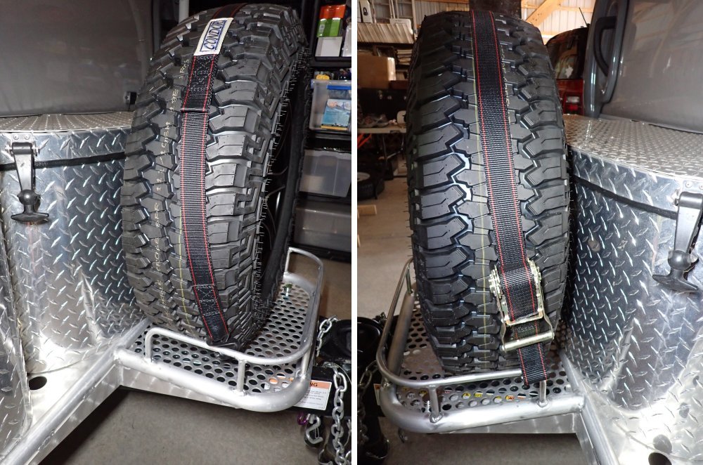 Found a matching Wheel/Tire combination and mounted a Spare Tire Mount from Harbor Freight with a back plate on the front tub. Tire weight rests on the front platform tight to the railings.