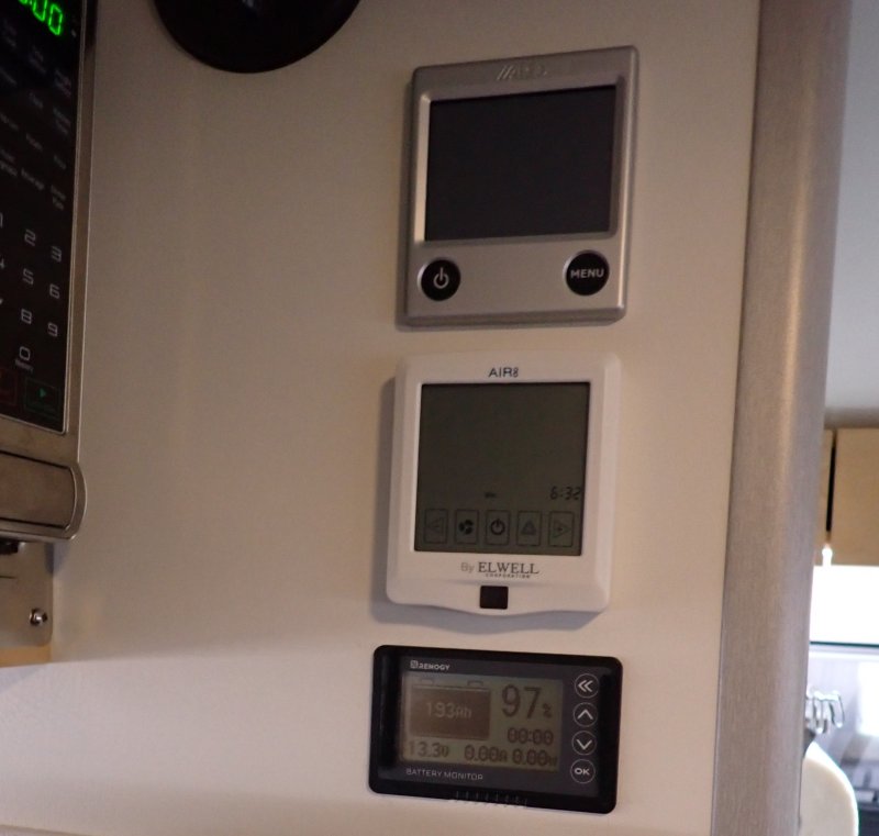 - Two 100ah Lithium batteries (inside), Victron Smart Charger and Renogy Battery Shunt and Monitor